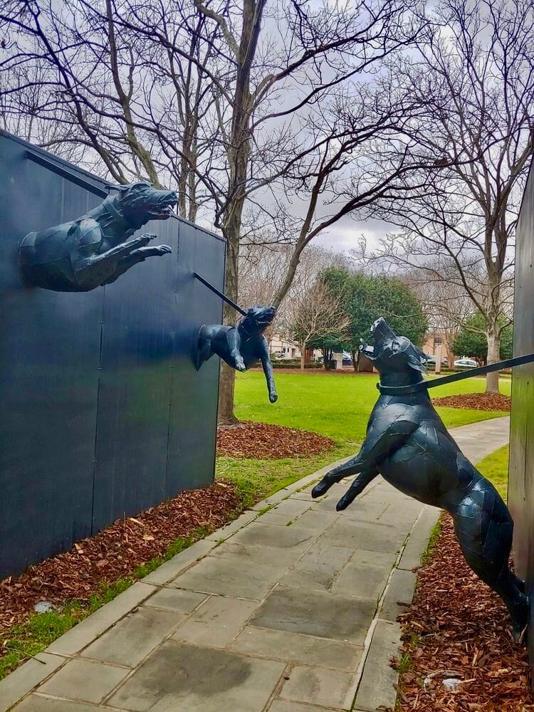 Police and Dog Attack (1993) by James Drake in Kelly Ingram Park, Birmingham, AL. tt evokes the police response to the Civil Rights Movement marches there in 1963. (Photo by Alexis B 2/1/2020)